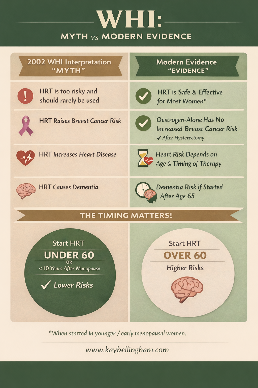 Modern menopause research describes this as the ‘timing hypothesis’. Women who begin hormone therapy before age 60 or within 10 years of menopause generally experience a more favourable balance of benefits and risks.