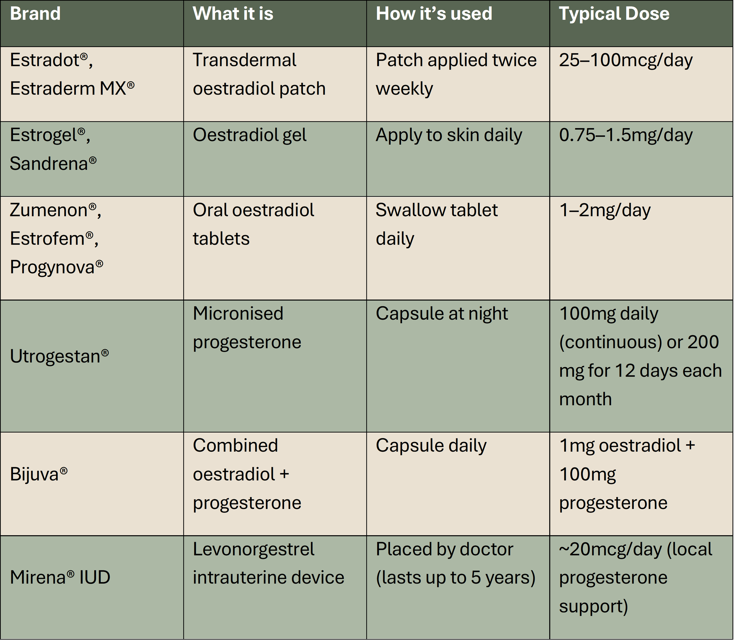 The popular choice is body-identical transdermal (patches or gel) or vaginal (pessary) delivery systems of oestrogen and/or combined with micronised progesterone capsules. Transdermal delivery of oestradiol avoids the risk of interacting with clotting factors in the liver so lessens the risk of blood clots previously associated with oestrogen therapy.